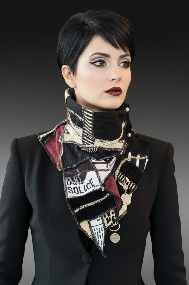 Statement refashion Street style style cowl in Black, tan, dark magenta, hints of mustard and bold newsprint fabric, plus embellishments, faux fur and more. Boho or artisan couture fashion style button up turtle neck style neck warmer. Funky and functional artistic fashion accessory. Fabrics are a blend of cotton blend, knits, nylon and polyester soft fabrics plus satin and lace. One of a kind. Collar is flexible and draping. Folds over nicely. Collar at the top is thicker for a stand-up style and perimeter is draping and flexible / lightweight.