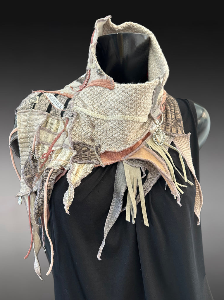 Statement boho style cowl in taupe plus cream and hints of pale pink and blush hues with charms and embellishments. Boho or artisan couture fashion style pull over turtleneck style neck warmer. Funky and functional artistic fashion accessory. Fabrics are a blend of cotton blend, knits, nylon and polyester soft fabrics. One of a kind. Collar is flexible and comfortable.