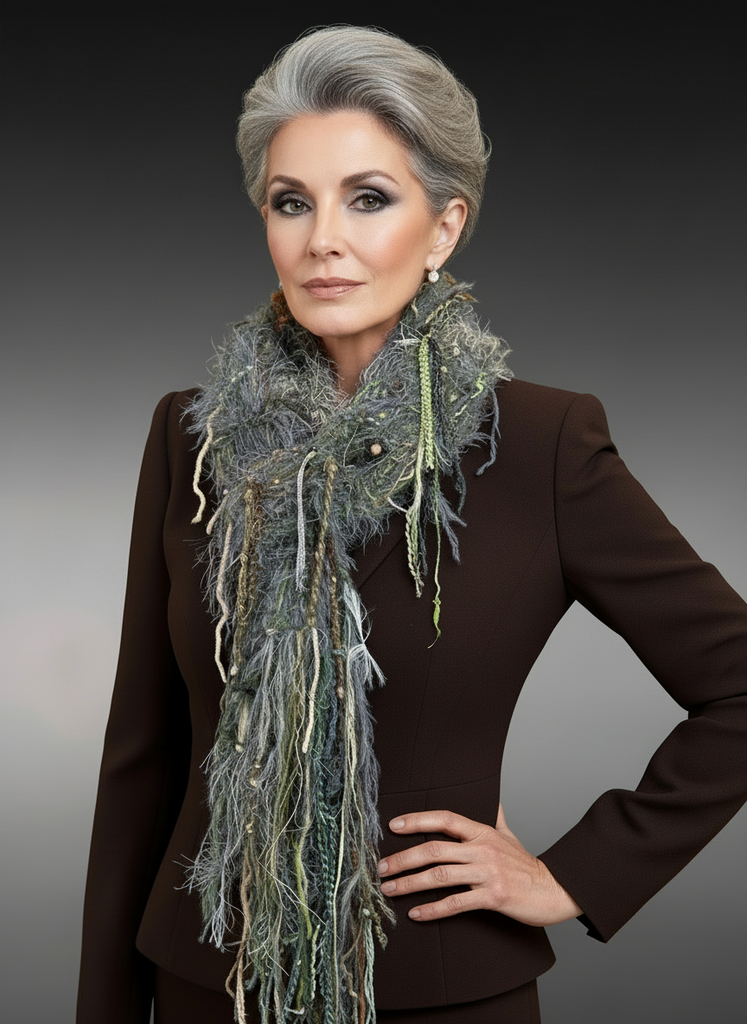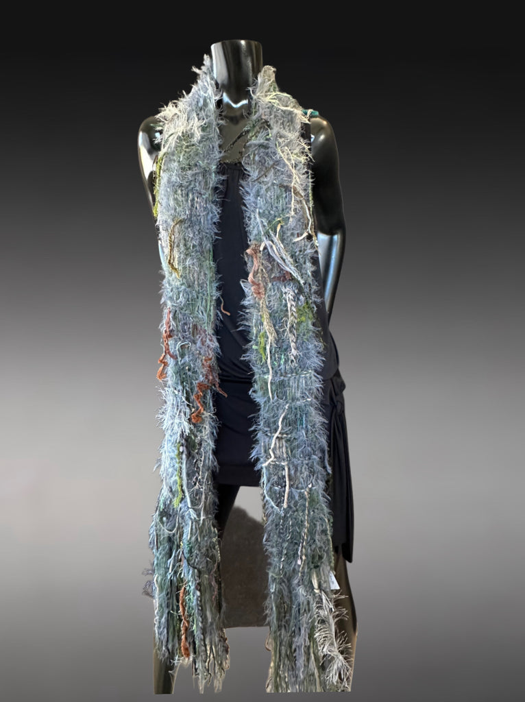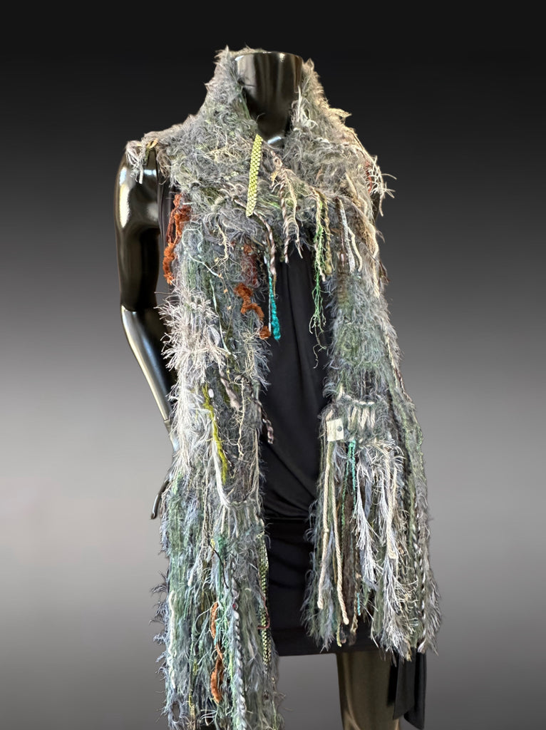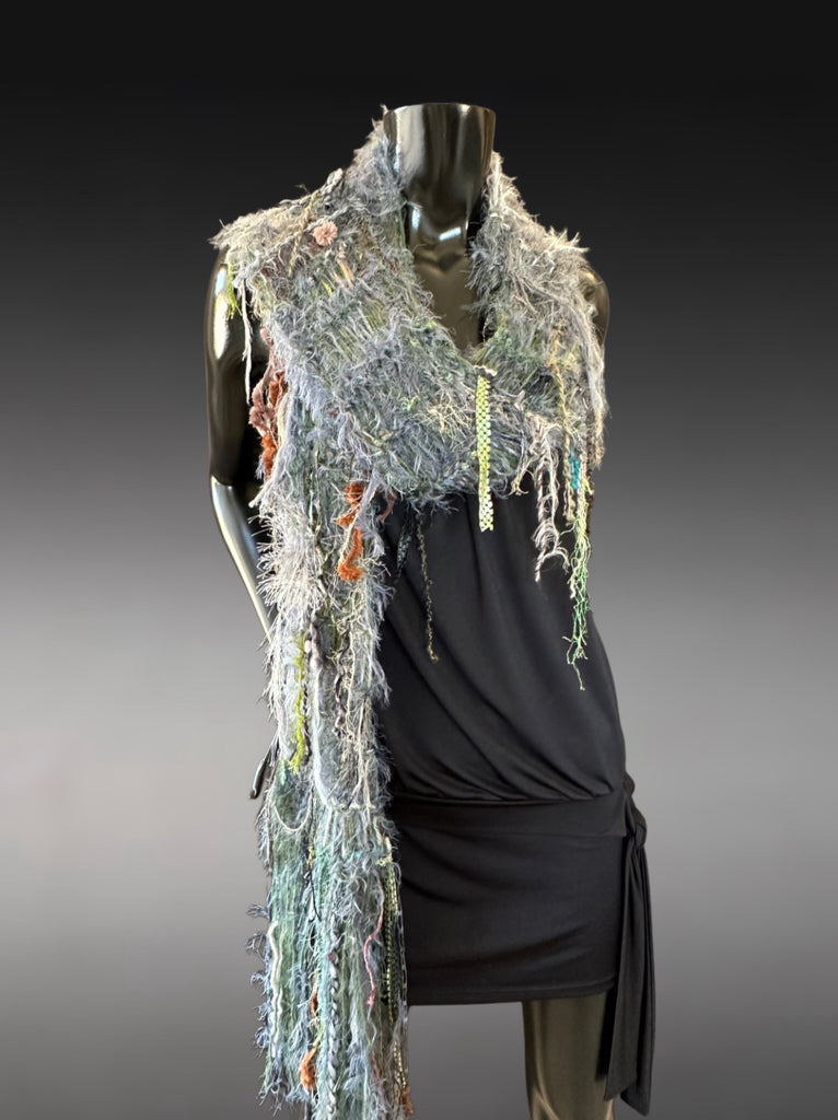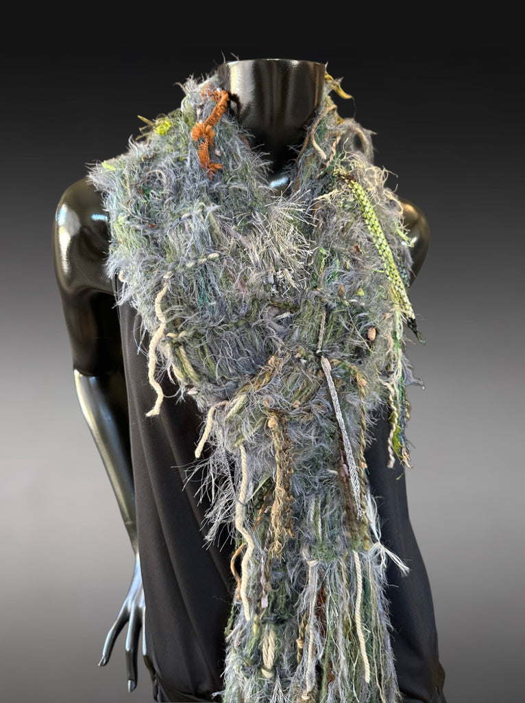 Wrap yourself in texture and artistry with this handmade boho fringe scarf, crafted from an eclectic mix of art yarns, textured fibers, and earthy sage–grey tones. This statement piece blends bohemian style, eclectic wearable art, and a touch of rustic woodland charm, creating a long, flowing accessory that transforms any outfit.