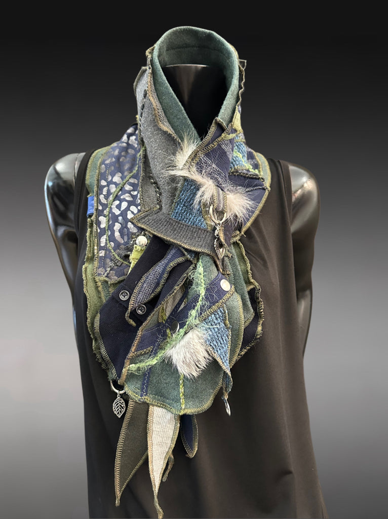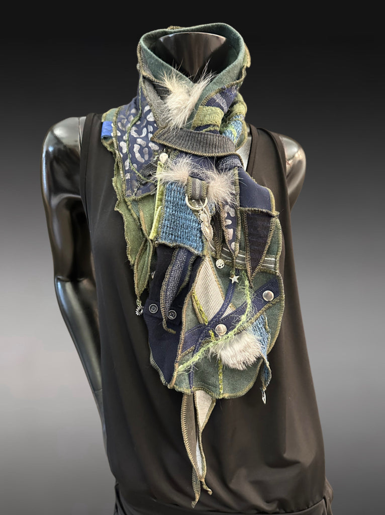 Pull-through upcycled eco-friendly avant garde fashion fabric scarf with embellishments - artisan fashion scarf. The variety of textures and detailing makes this artsy and classy. Includes two gathering loops strategically located for versatile styling as a cowl or scarf, with options based on which side you put the loop ends on (start with it over left versus right shoulder). Stand-up neck styling. Includes tidbits of grey fox fur.