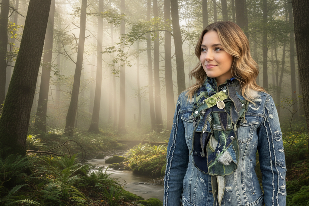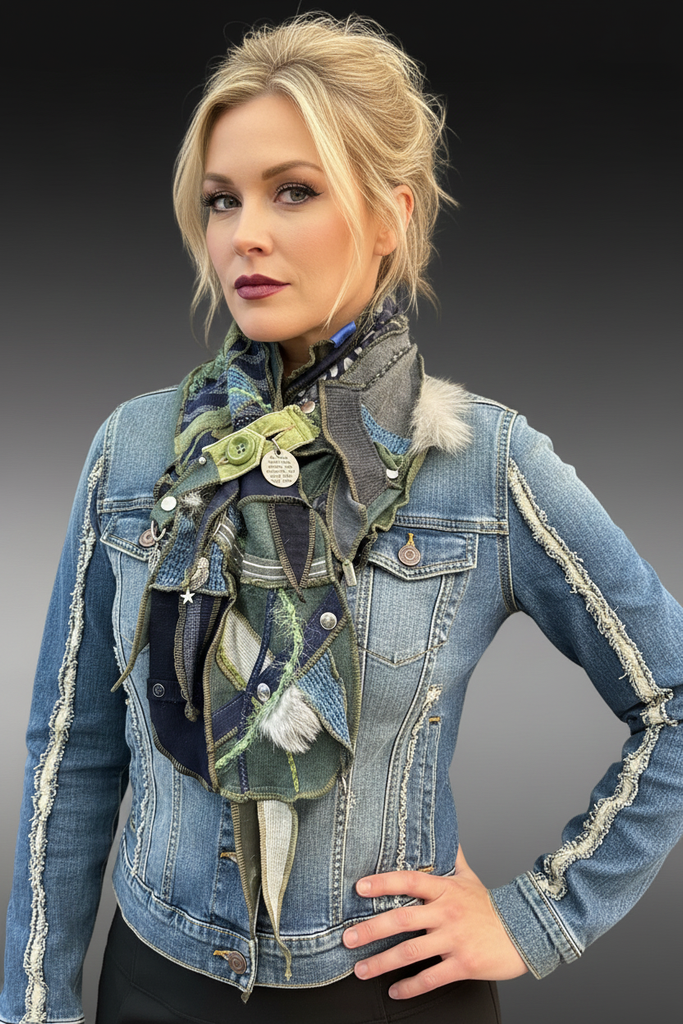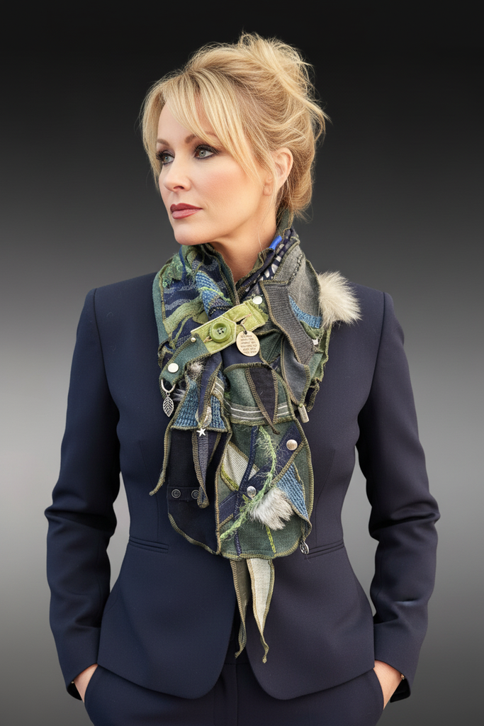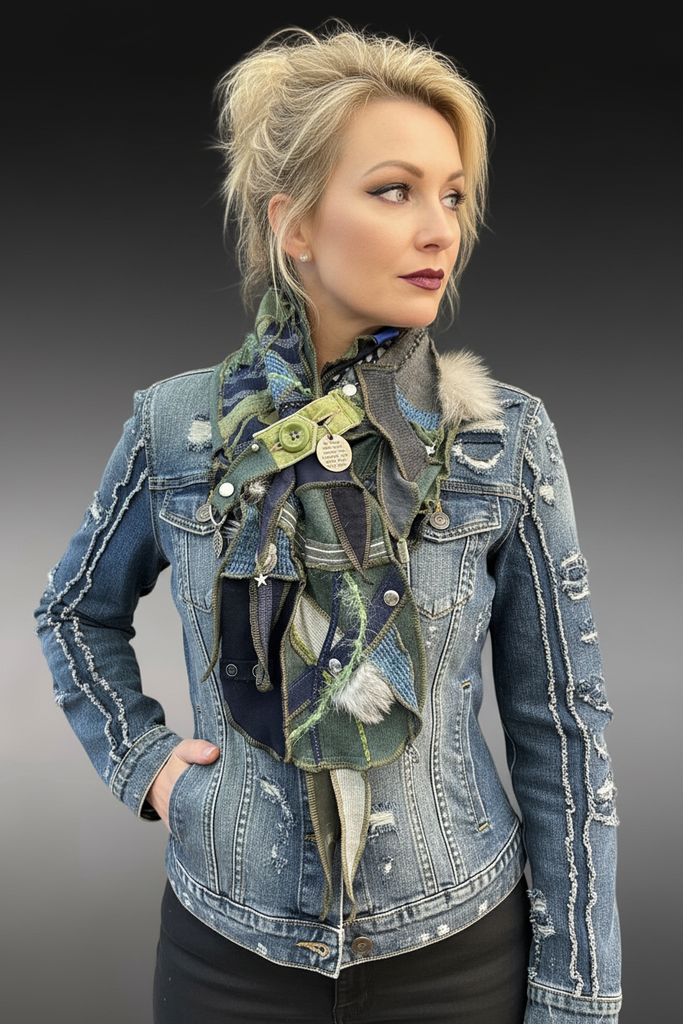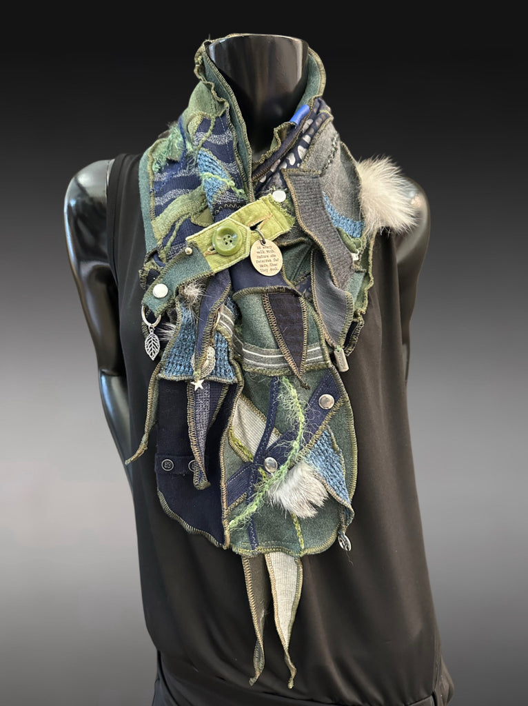 This handcrafted statement scarf adds instant edge and subtle color to any outfit — perfect for those who were born to stand out. Colorblend of casual, subtle blue, sage and olive and a touch of gray.