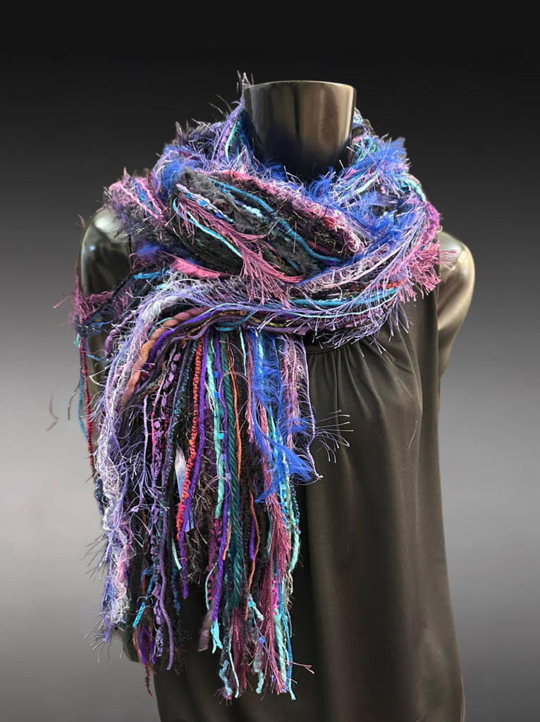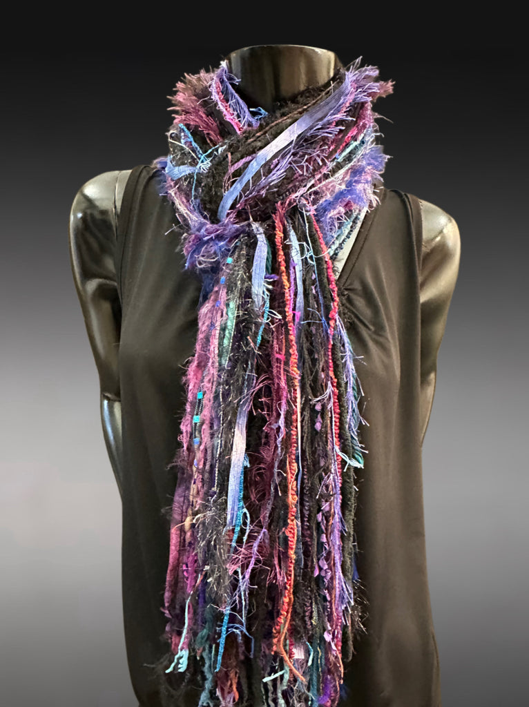 A gorgeous fun casual colorblend with great textures! Snuggly soft! Perfect for all season wearing, and great for fall and winter warmth! These are not knit or crocheted or sewn. Approximately 25+ different artistic andd novelty fibers hand-tied into a wonderful all-fringe scarf.
