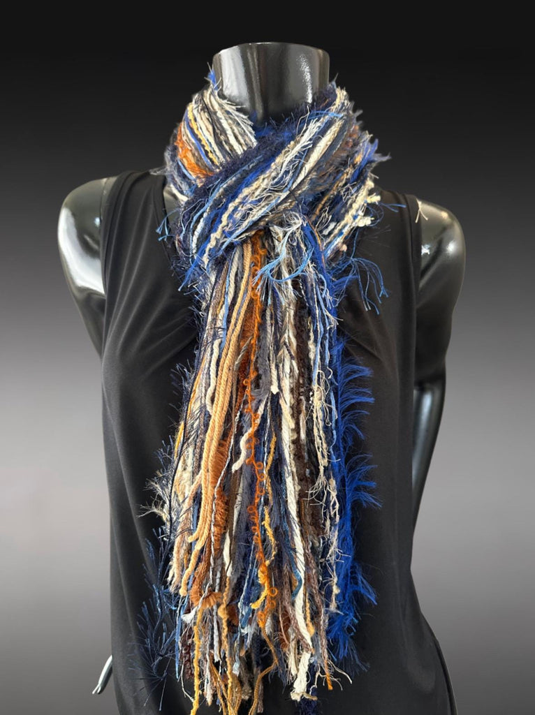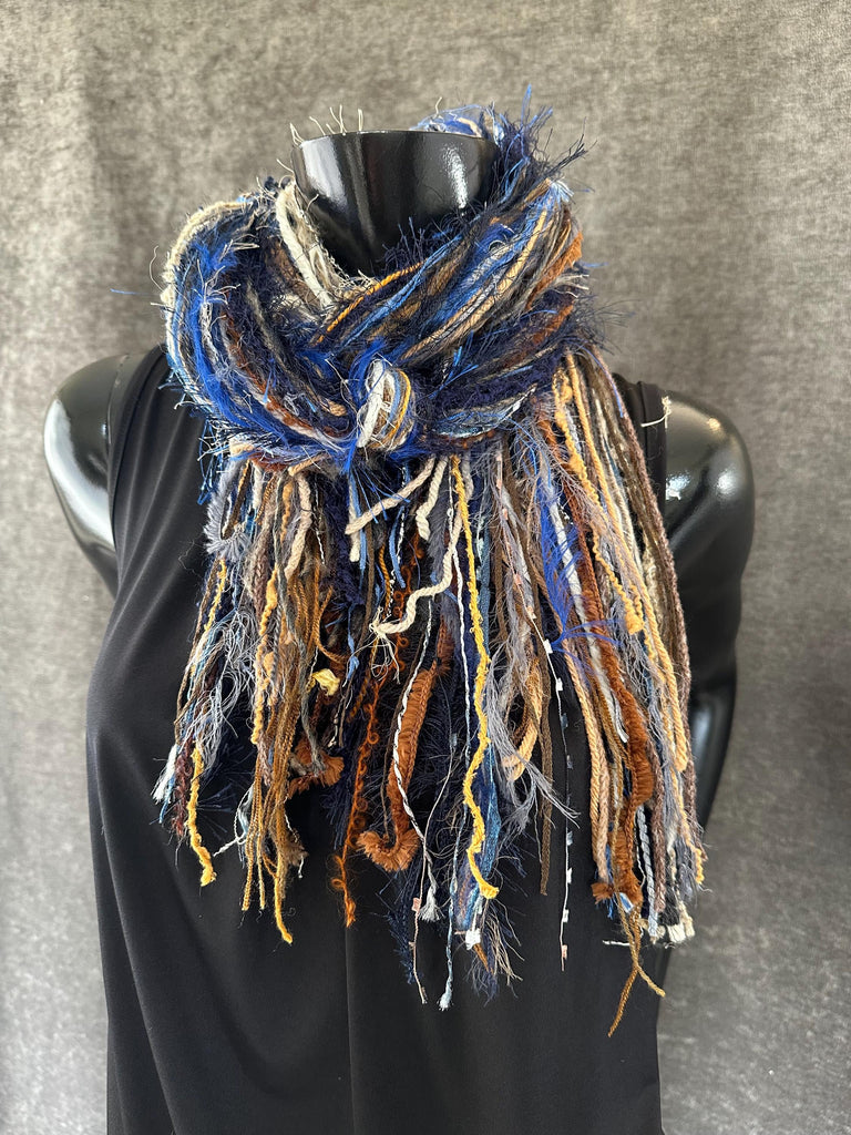 Add a pop of texture to your wardrobe with artsy fringe! These are not knit or crocheted or sewn. Approximately 25+ different artistic and novelty fibers hand-tied into a wonderful all-fringe scarf.