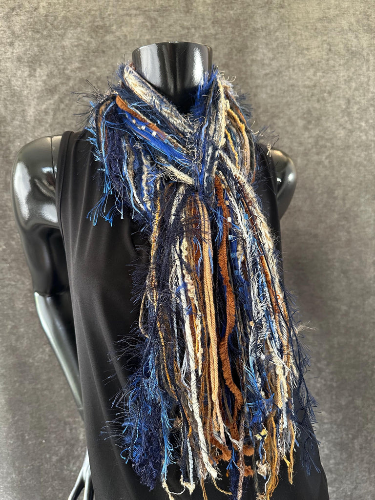 A unique artwear boho or tribal style fringie scarf in light and medium jean blues, navy and various beige hues plus cream and medium browns. One of a kind scarves keep your wardrobe original! Perfect with jeans!