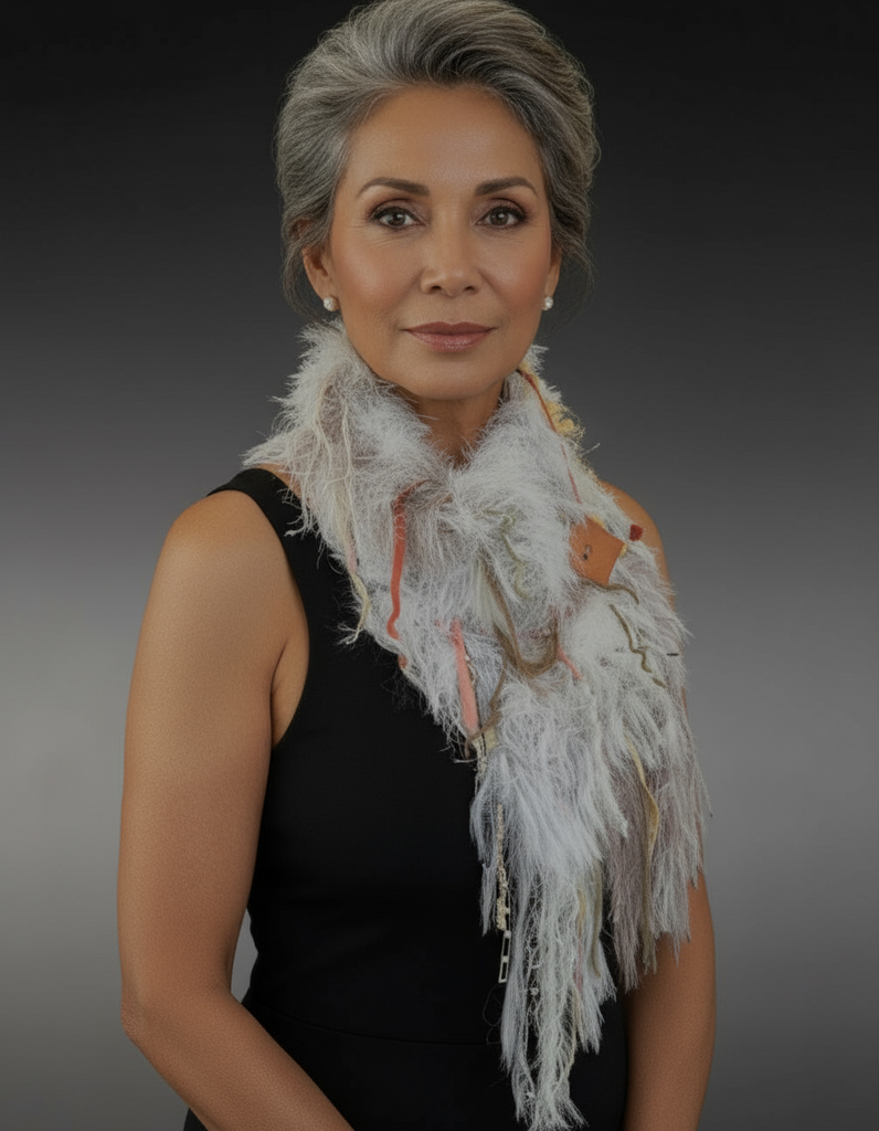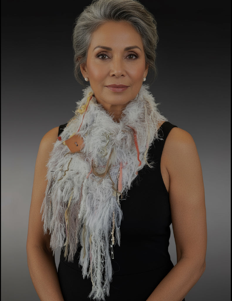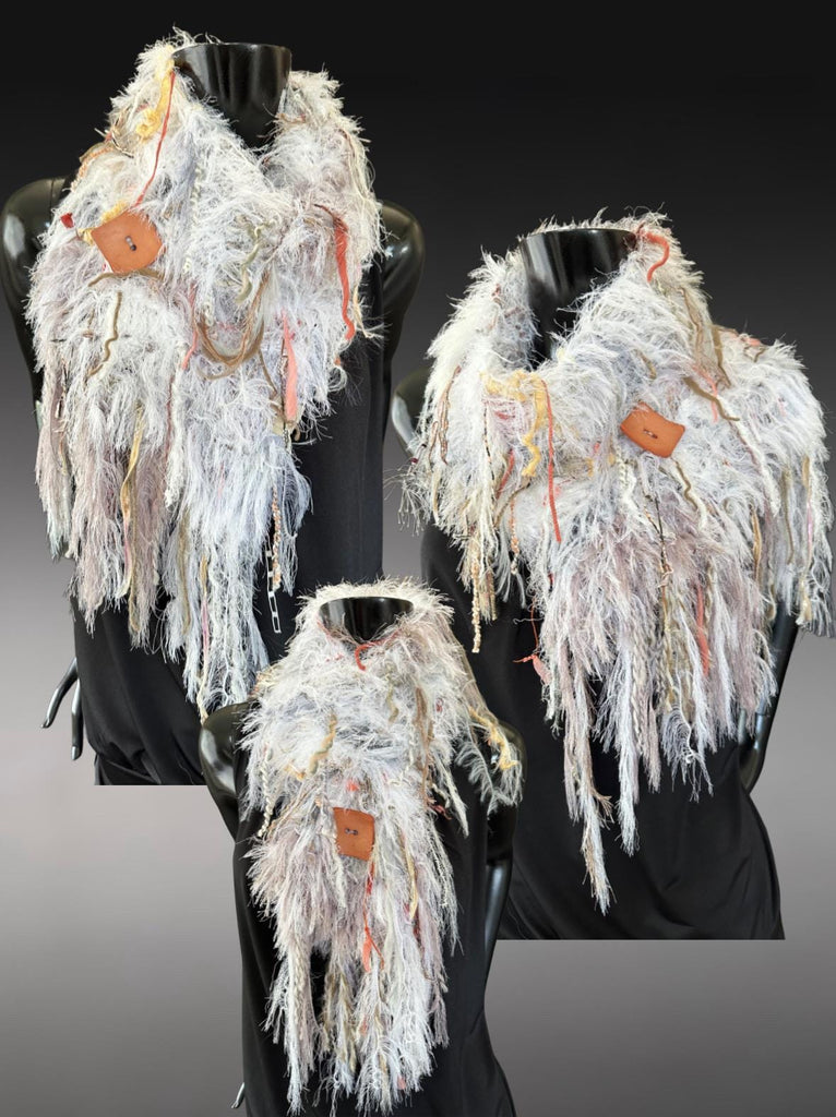 Stand out in the crowd with an Original Dumpster Diva knit scarf! These scarves are made from my own self-created patterns and hand-tied yarn blends with materials from all over the world, including hand made yarns. All are one of a kind so you have a unique piece!