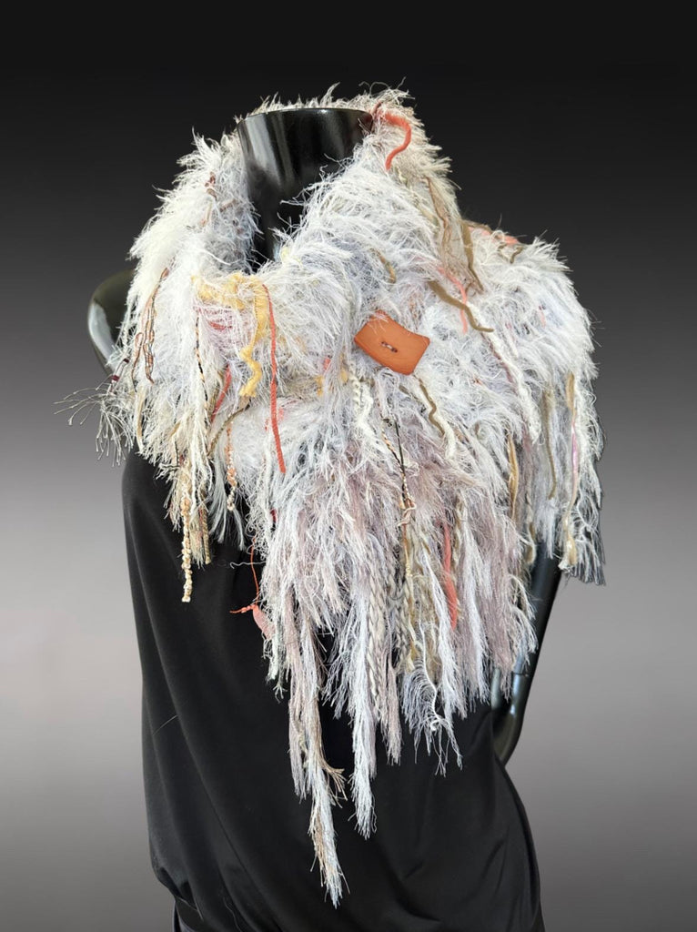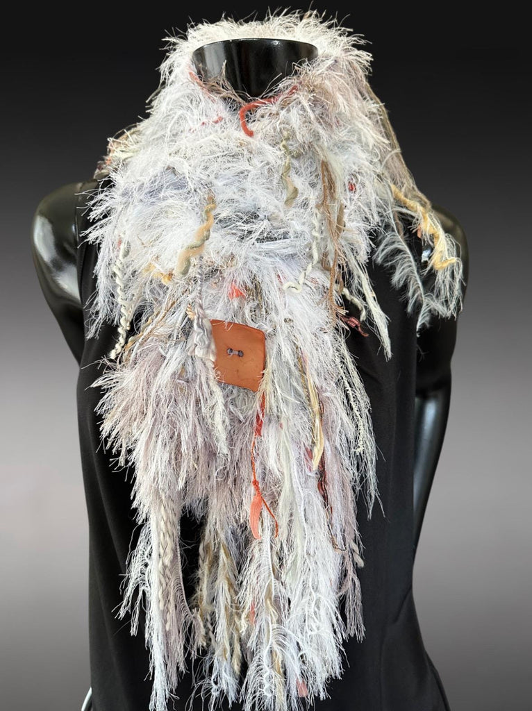 Fluffy ivory faux fur knit scarf with oversized button and art yarns. Includes 20+ unique art yarns and fibers with subtle coordinating colorblends and oversized salmon-blush colored button.