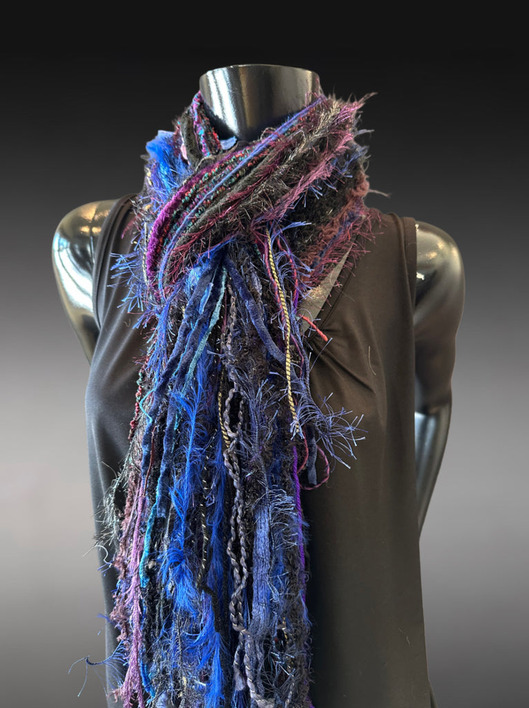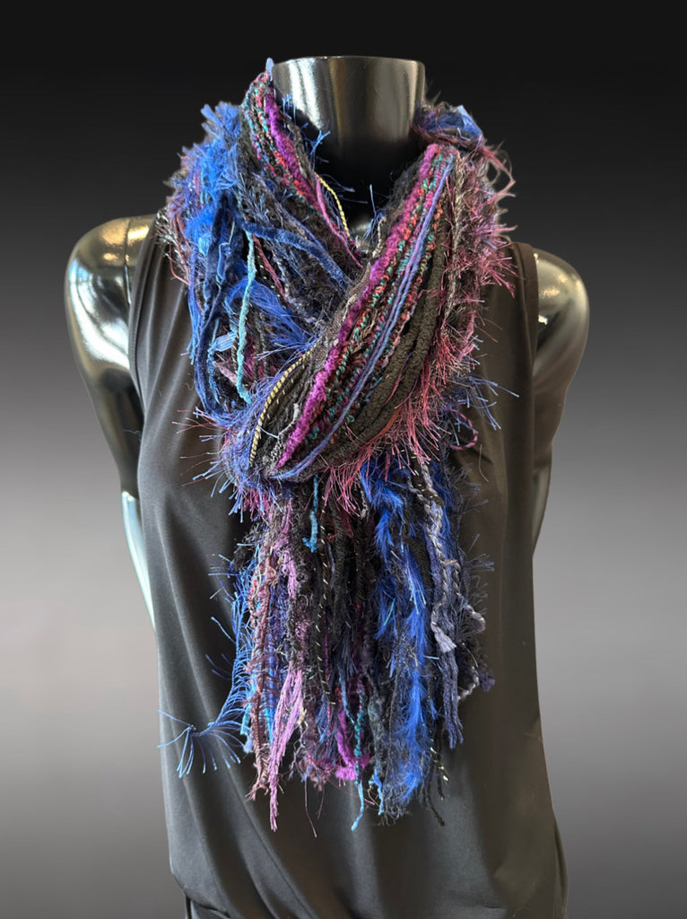 A gorgeous fun casual colorblend with great textures! Snuggly soft! Perfect for all season wearing, and great for fall and winter warmth! These are not knit or crocheted or sewn. Approximately 25+ different artistic andd novelty fibers hand-tied into a wonderful all-fringe scarf.