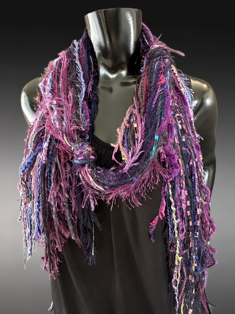 A Funky Fringie handmade bohemian scarf for the lady who loves deep rich purples, black and blues plus jewel tones.