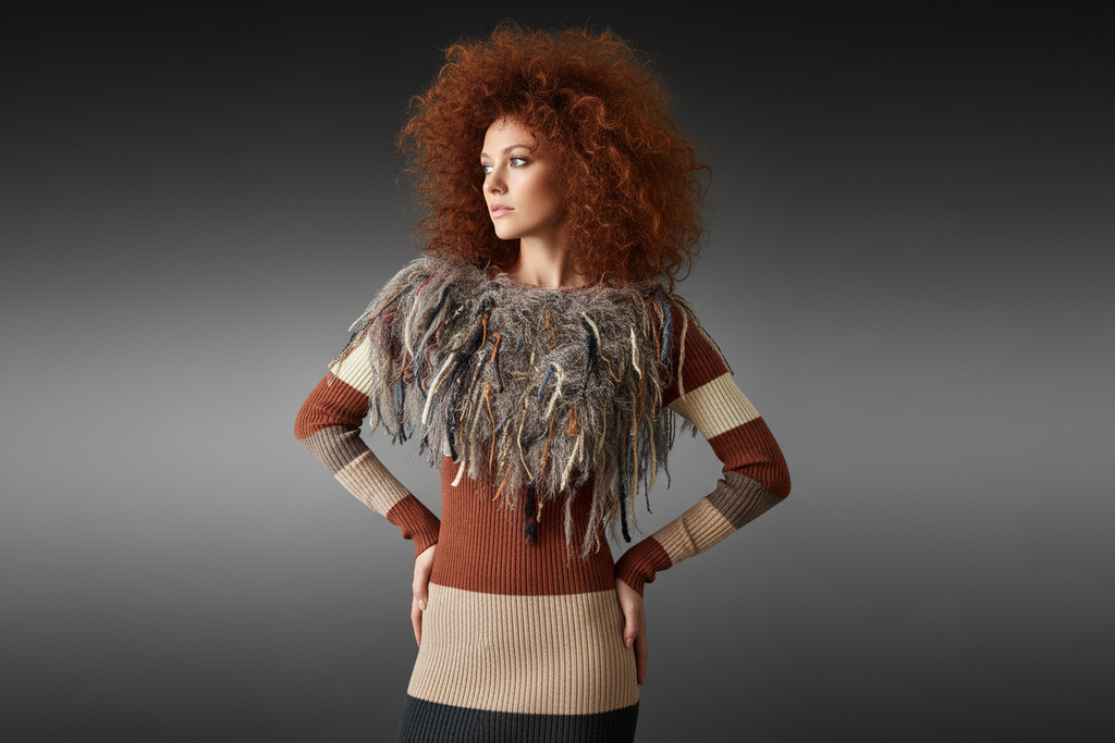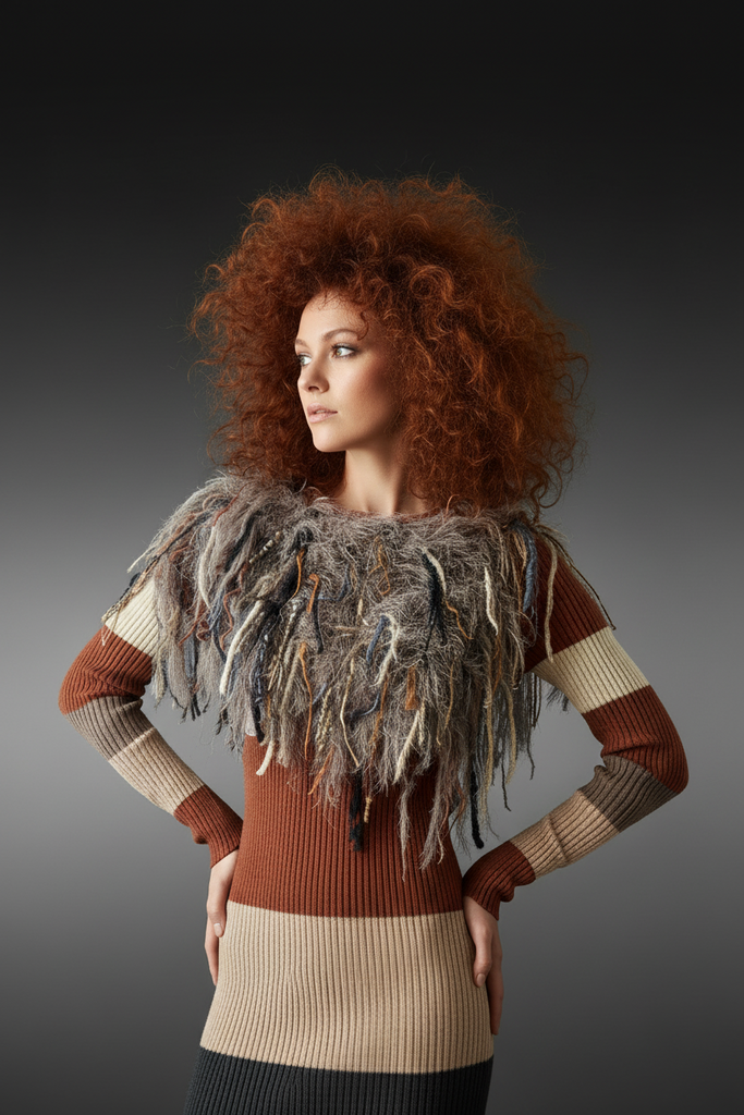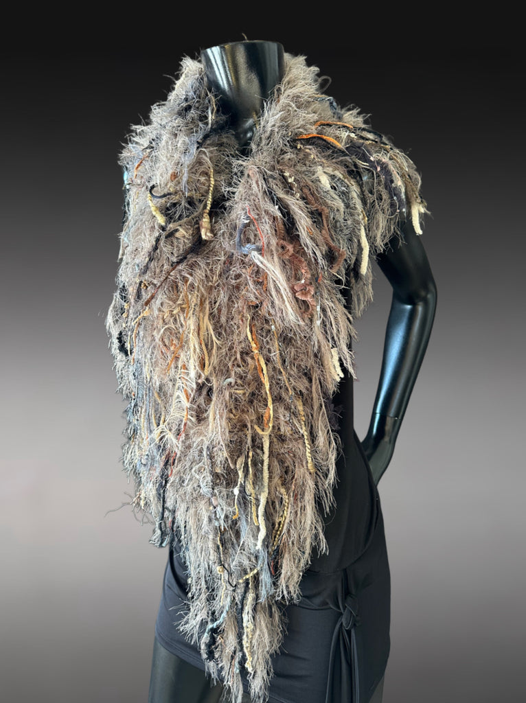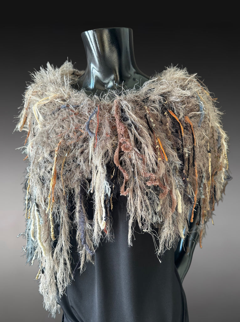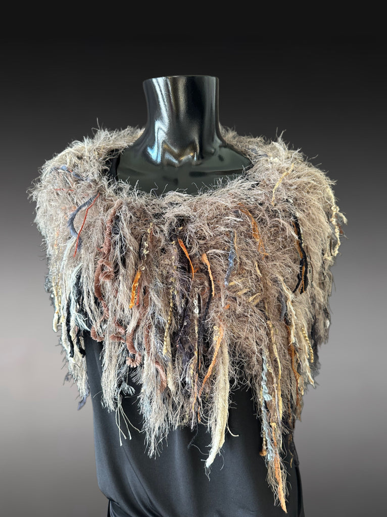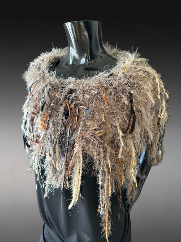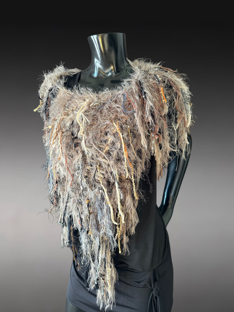 Stand out in playful, luxurious fringe in a couture shape for the statement fashion style. Fur taupe shoulder wrap or capulet style poncholette. Faux fur art yarn with subtle blends of charcoal, browns and hints of muted rust, ivory gray, taupe and hints of black.