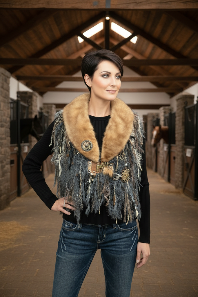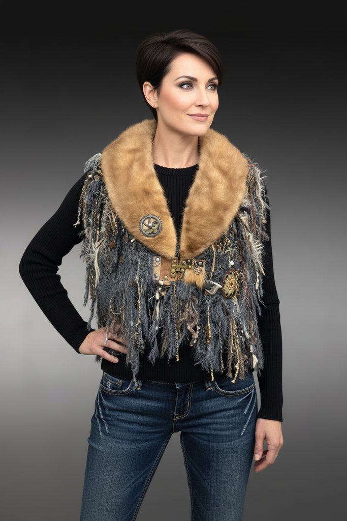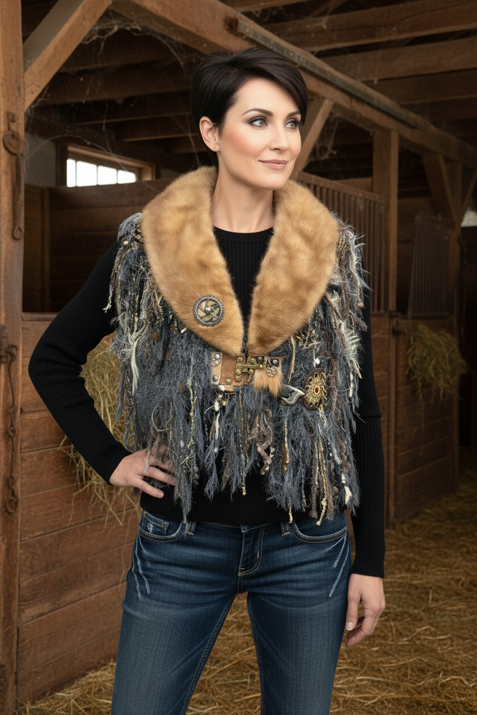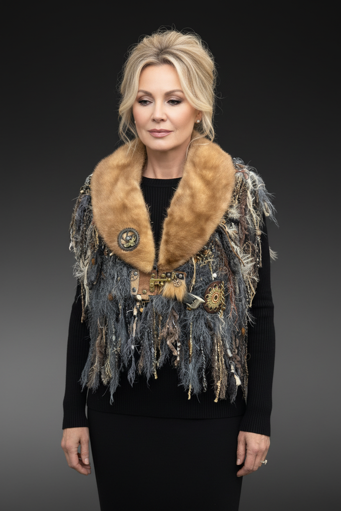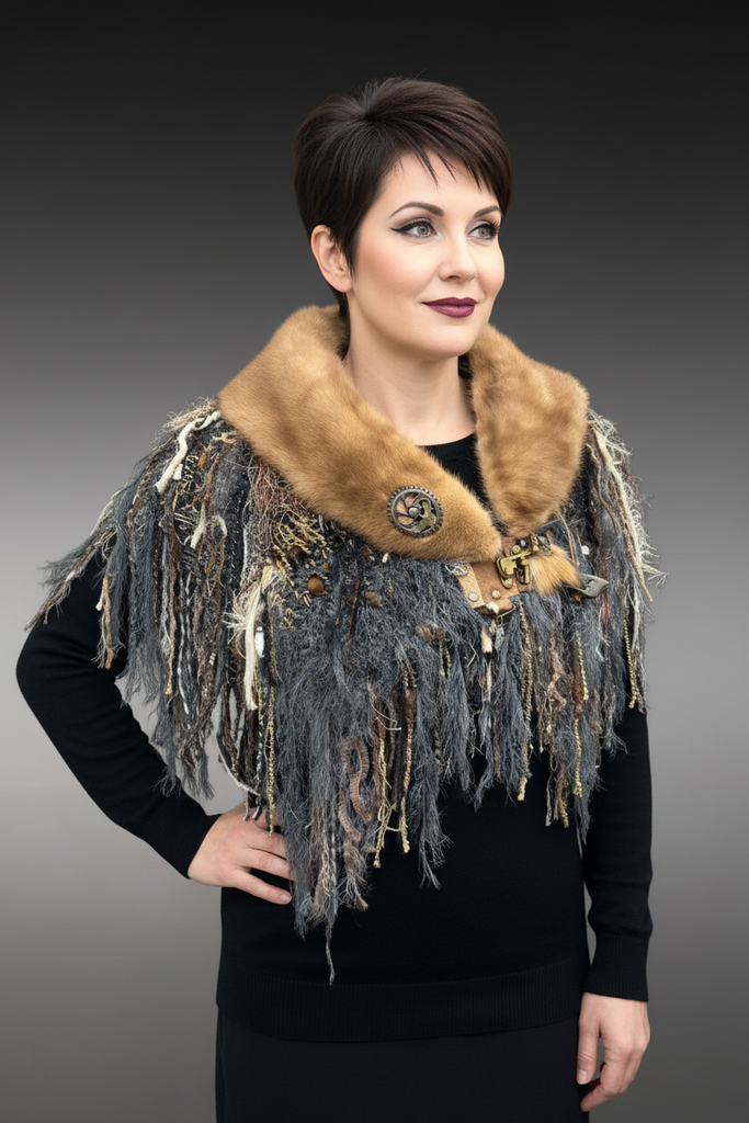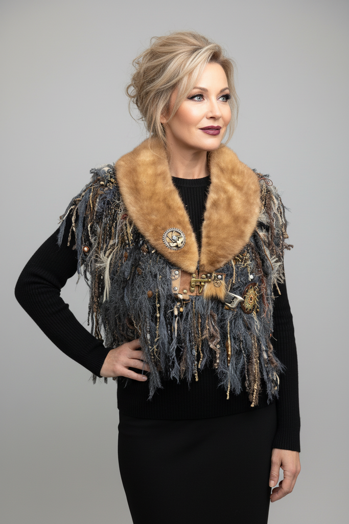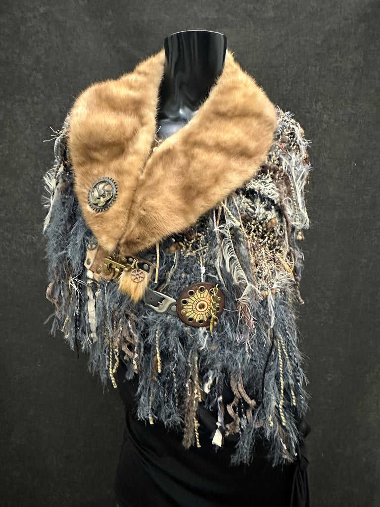 This artisan beaver fur collar statement shawl merges high-end texture with handcrafted fiber artistry. Designed as a sculptural shoulder wrap, it features a golden reclaimed beaver fur neckline paired with layered specialty yarns, dramatic fringe, and industrial-inspired accents for a refined rustic aesthetic. Clasp plus hidden magnet for more closure at the V neck if desired.
