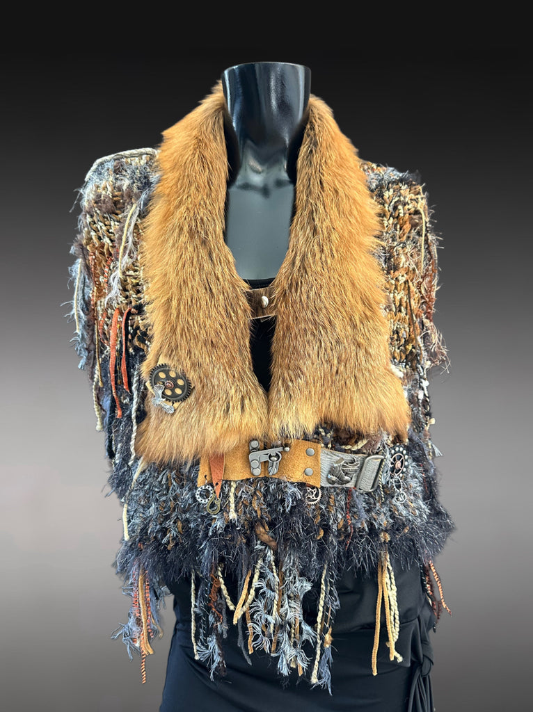 This piece blends bohemian texture, rustic elegance, and avant-garde design. Works well for special events, cowgirl style fashion, renaissance fairs and more.