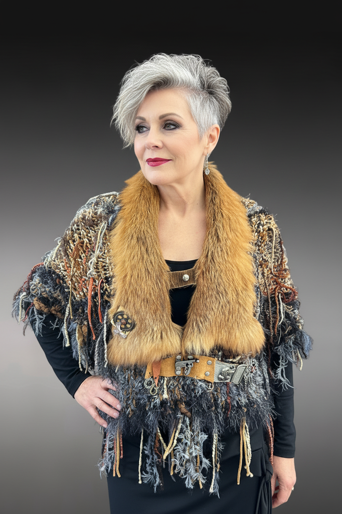 Make a statement without saying a word. This handcrafted statement poncho shoulder wrap is designed for women who embrace individuality, texture, and wearable art. Featuring layered fibers, rich earth tones, and a premium rich red fox hide collar, this poncho transforms any outfit effortless into a luxury, gallery-worthy look.